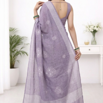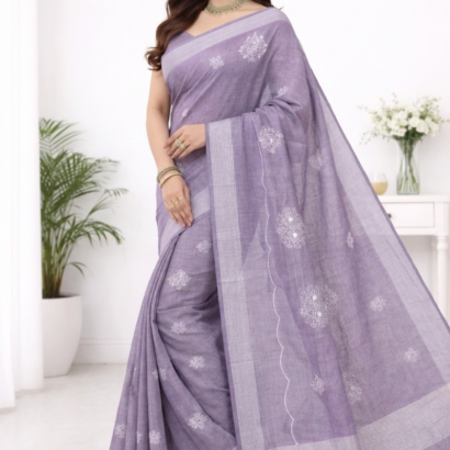 Elegant Lavender Grey Embroidery Linen Saree for Office & Casual Wear